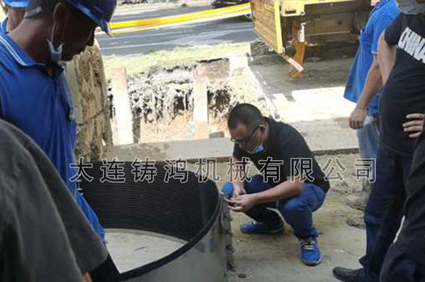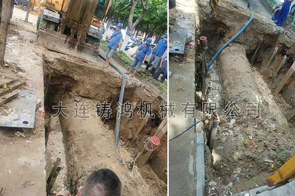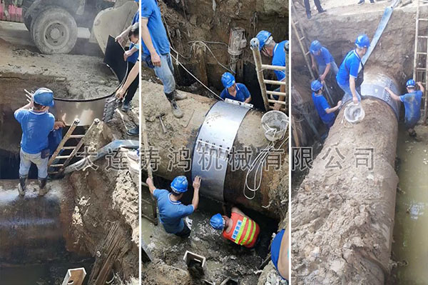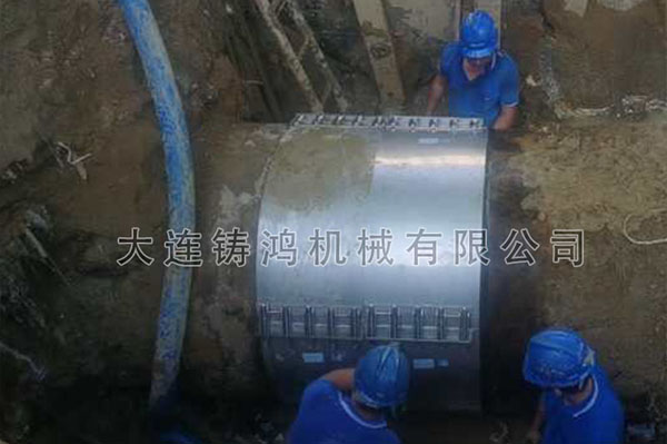 佛山市禪城區(qū)供水有限公司發(fā)現(xiàn)一處管道發(fā)生泄漏, 管道外徑1420mm,管道壓力4公斤左右,漏點(diǎn)10mm,管道材質(zhì)為鋼管,用鑄鴻無限延長(zhǎng)修補(bǔ)器兩片長(zhǎng)度500mm完美解決漏水問題。