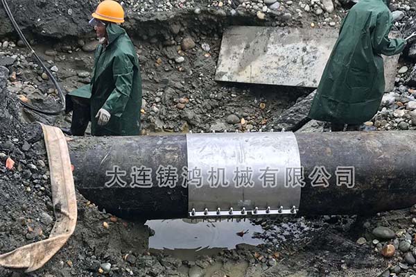 成都雙流區(qū)非標鋼管發(fā)生泄露,管道外徑為628mm,漏點為二十公分縱向裂縫,管道有變形且表面凸凹不平,凸起高度約為2—3mm,使用我司620—640板式修補器800mm快速搶修,得到水司領導高度認可。