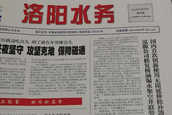 洛陽橋涵426球鐵架空管道泄露,裂縫從承插口斜面喇叭口位置一直到直管段,裂縫長達(dá)3.2米并有空間限制,采用無限延長修補(bǔ)器2個(gè)1米長,1個(gè)1.2米,1個(gè)承插口修補(bǔ)器,產(chǎn)品總長度3.6米,將承插口修補(bǔ)器一邊卡在插口管道,另一邊卡在承口這邊的修補(bǔ)器上,產(chǎn)品安裝靈活,操作方便,現(xiàn)已通水,搶修非常成功,由于工況特殊各級領(lǐng)導(dǎo)都非常關(guān)注,此工況得到水司領(lǐng)導(dǎo)的一致好評!并在洛陽水務(wù)報(bào)刊登報(bào)道,洛陽領(lǐng)導(dǎo)已將此工況上報(bào)中國水務(wù)報(bào)。