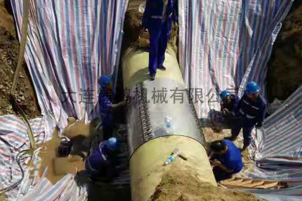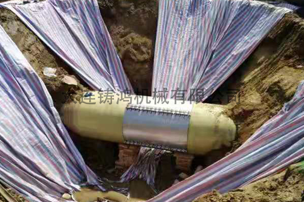 70周年國慶期間,北京水務(wù)集團(tuán)發(fā)現(xiàn)某路段管線流量異常,經(jīng)過排查,鎖定一處DN1200玻璃鋼夾砂管,挖開后發(fā)現(xiàn)管體破損泄漏,原先修補(bǔ)都是采用傳統(tǒng)的粘糊方式進(jìn)行修復(fù),修復(fù)時間至少需要30個小時以上,并且需要停水,此次使用鑄鴻板式修補(bǔ)器進(jìn)行快速帶壓修復(fù),不到 2個小時安裝完畢,恢復(fù)正常供水。由于產(chǎn)品的突出性能和時效,已經(jīng)被北京水務(wù)集團(tuán)列入搶修后勤保障配件。